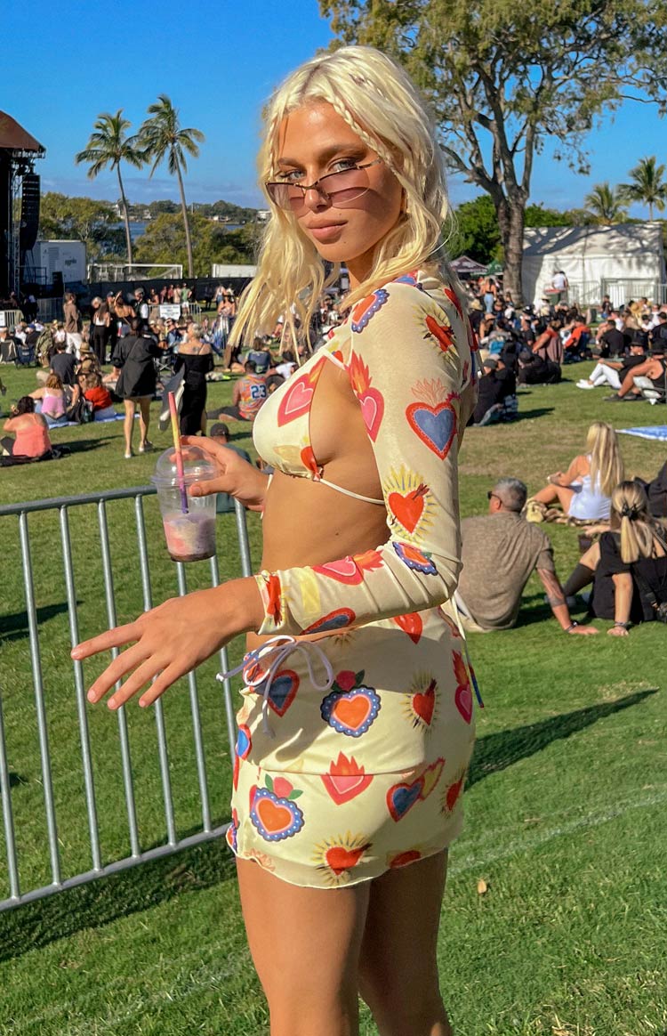 Rosaline Yellow Heart Printed Mesh Mini Skirt